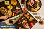 [REVERSIBLE, MULTIPURPOSE]: This large walnut wood cutting board features a juice groove design on the front side to catch liquids while cutting, chopping, and dicing. Its spacious surface caters to all your culinary needs. Built-in handles ensure comfortable carrying and maneuvering. The back side offers a flat, versatile space for prepping ingredients, serving grilled meats, displaying cheese platters, or acting as a kitchen mat. Perfect for BBQs, parties, or everyday cooking, this is the ideal cutting board for kitchen use.
